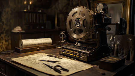 Explore a vintage film editing station showcasing a classic reel, antique tools, and papers. This retro workspace embodies the artistry and craftsmanship of film production.