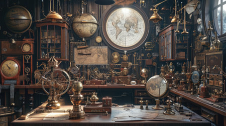 An intricately detailed vintage study room, filled with navigational instruments, antique map, and explorers tools, evoking the spirit of discovery. Resplendent.