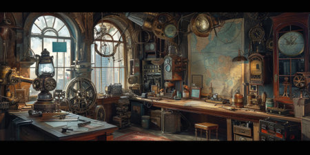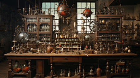 A nostalgic workspace featuring a wooden desk cluttered with scientific instruments, blueprints, and writing tools, inspired by creativity and research.