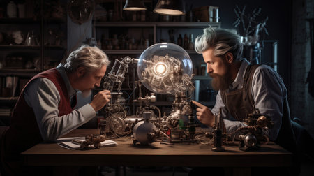 Two inventors are working hard to create a futuristic device with a fantasy twist