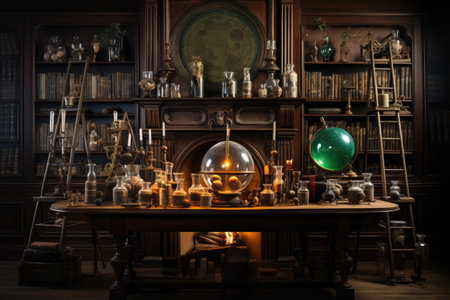 Philosopher's study with ancient scrolls instruments soft candlelight