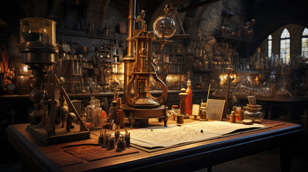 A captivating vintage laboratory setting showcasing an antique microscope, illuminated workspace, and detailed maps, evoking a sense of scientific exploration and historical research.