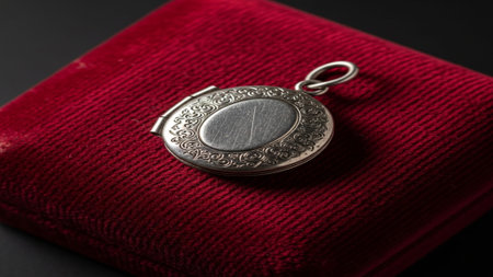 Editorial close-up shot captured from a high angle, showing a small, vintage silver locket placed up