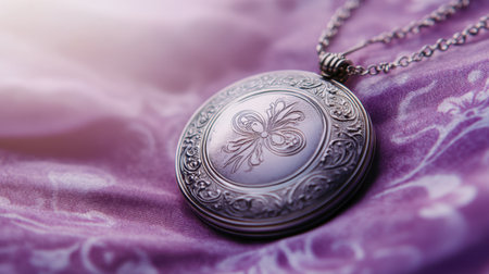 This beautiful image showcases an antique silver locket featuring an intricate butterfly design, elegantly resting on soft purple fabric, symbolizing nostalgia and charm.