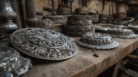 Medium shot of decorative zinc alloy castings with detailed patterns displayed on a craftsmans workbench.