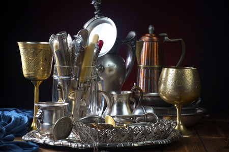 A collection of elegant silverware and vintage objects, including teapots and trays, beautifully arranged at an antique market, evoking history and sophistication.