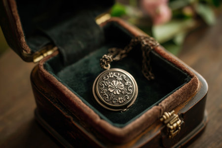 Close-up of a classic engraved locket on a chain, nestled in a velvet-lined vintage jewelry box