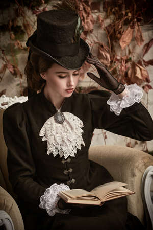 Portrait of a beautiful exquisite young lady of the 19th century sitting in an armchair and reading a book. Historical reconstruction of the late 19th and early 20th century.