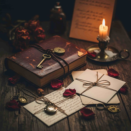 Memories - old family photo album with necklace, old books and dried flowers and candles