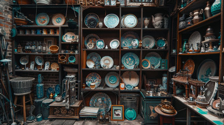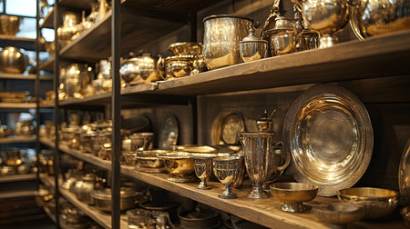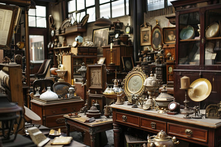 An antique shop filled with various brass and glass items, showcasing vintage and collectible artifacts on wooden shelves, creating a nostalgic and historic atmosphere.