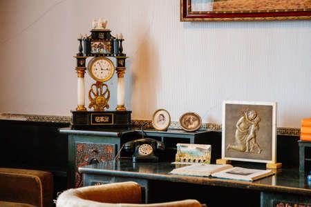 Castle interior, office with black desk and armchair, clock and telephone, photos on table, Secession art nouveau style, renaissance chateau Nove mesto nad Metuji, Czech Republic, June 12, 2021
