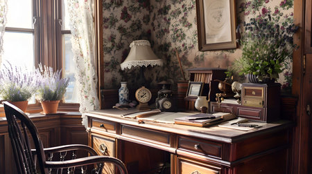 A captivating home study room showcases an antique oak desk that exudes timeless elegance, complemented by Victorian decor and fragrant lavender plant accents on a floral chintz wall This inspiring
