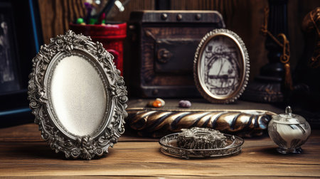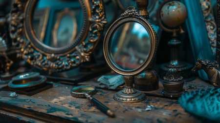 A collection of vintage mirrors and trinkets displayed on an antique wooden table, creating a nostalgic and charming scene.