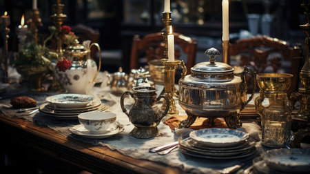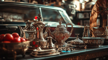 A collection of elegant silverware and vintage objects, including teapots and trays, beautifully arranged at an antique market, evoking history and sophistication.