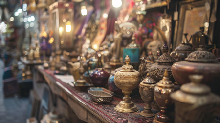 An eclectic collection of antique metal vessels, intricate designs, and decor pieces displayed in a vibrant marketplace setting.