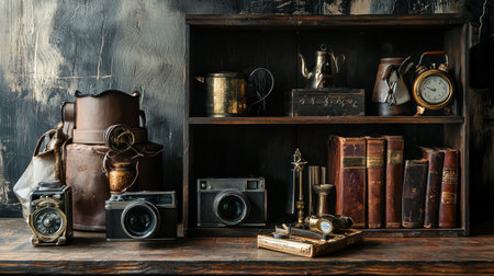 A vintage wooden shelf showcasing antique cameras, books, and classic decor items in a rustic setting, evoking nostalgia and timeless elegance.