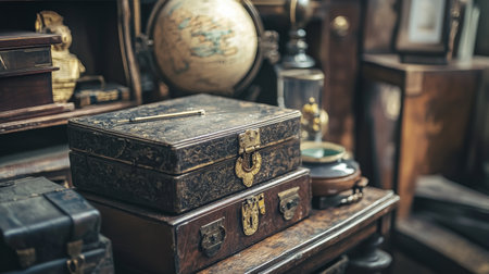 A vintage scene featuring a treasure chest, antique globes, and old books, creating a nostalgic and charming setup.