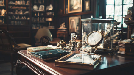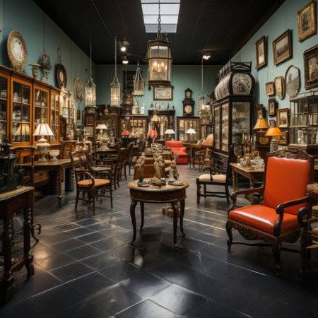 Antique furniture and collectibles arranged in a shop, creating a rich and historical ambiance.
