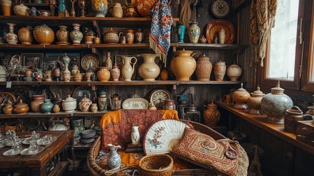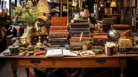 A charming antique shop interior with vintage items, rustic furniture, and colorful flowers in a glass vase, evoking nostalgia and artistic flair.