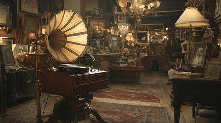 Explore an enchanting antique shop filled with vintage treasures, including a classic gramophone and framed photographs, creating a warm and nostalgic atmosphere.
