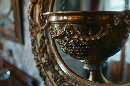 The reflection of a golden trophy in a mirror. --ar 3:2 Job ID: fd4d3927-1aab-4d18-acc1-71b12cfd8d0d
