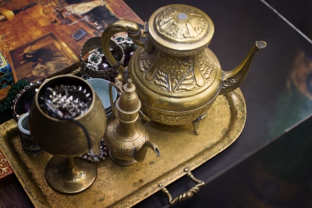 Vintage tea utensils cups and teapot prepared for the tea ceremony on the counter in the cafe