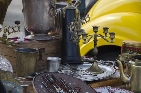 In the spring on the street old antique metal kitchen utensils and candlesticks