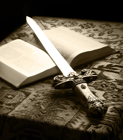 Closeap King age army read light paper page learn believe bless pray hebrew law steel iron metal sharp dark black table text space. New culture sacred spirit prayer art gold arm worship life sign icon