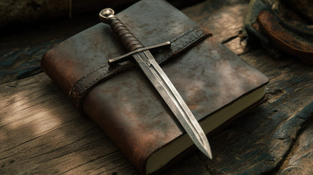 A stunning display of an antique leather journal with a vintage sword resting elegantly atop a wooden surface, captured in a rustic environment.