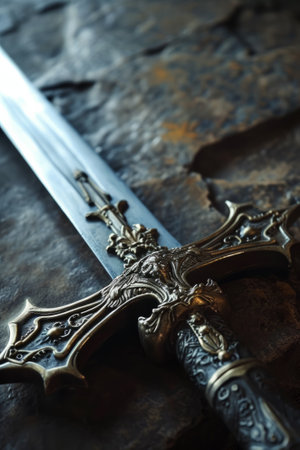 An ornate medieval sword stands upright its hilt and blade illuminated by dramatic lighting showcasing artistry and history.