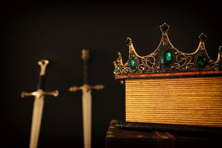low key image of beautiful queen/king crown over antique book, chest and sword. fantasy medieval period