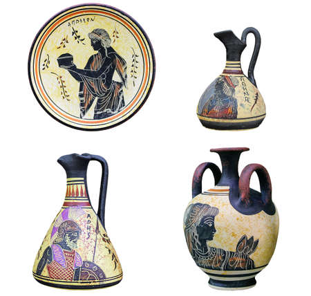 Set of three ancient Greek vases and dish isolated on white background. Images of Apollo, Athena, Aphrodite. Mythical heroes and gods of ancient Greece.