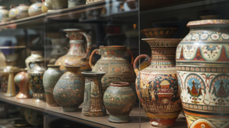 Collection of ancient pottery displayed on glass shelves, showcasing rich history and cultural craftsmanship, set in a warm museum ambiance.