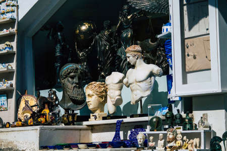 Santorini Island, Fira, Greece - October 23, 2021 Decorative objects, accessories and goods sold to tourists in souvenir shops of Fira, tourist town and capital of Santorini in the Greek Islands
