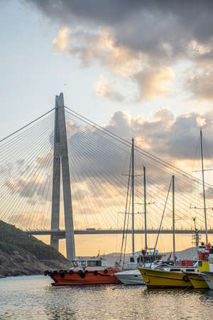 View of the Yavuz Sultan Selim Bridge in Istanbul, Turkey. Sunset time. Small port with yachts and fishing boats in front of Third Istanbul bridge.