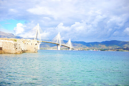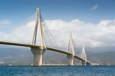 Panoramic view of Modern Bridge with white clouds. Rion-Antirion Bridge, Greece, Europe. The Rion-Antirion Bridge in Greece one of the world's longest multi-span cable-stayed bridges and the longest of the fully suspended type bridge