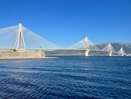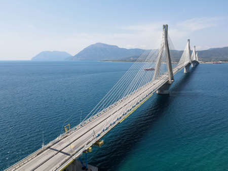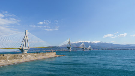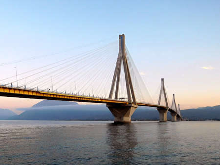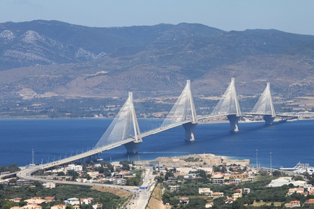 Cable-stayed suspension bridge crossing Corinth Gulf strait, Greece. It is one of the world's longest multi-span cable-stayed bridges and the longest of the fully suspended type