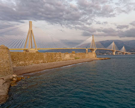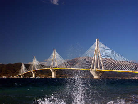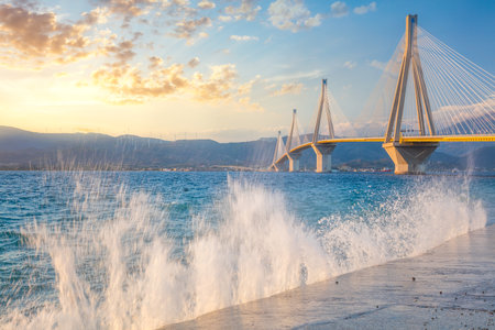 Amazing view - Modern Bridge at the evening sunset time with waves splash. Rion-Antirion Bridge, Greece, Europe. The Rion-Antirion Bridge in Greece one of the world's longest multi-span cable-stayed bridges and the longest of the fully suspended type brige