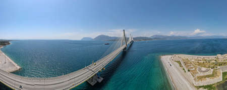Panoramic aerial view Bridge Rion-Antirion. The bridge connecting the cities of Patras and Antirrio, Greece