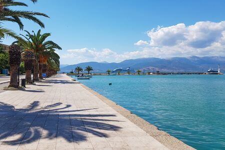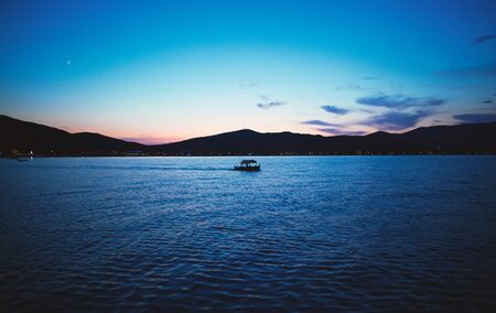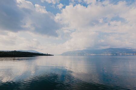 Sunset. Beautiful Mediterranean landscape. Montenegro, Adriatic Sea. View of Bay of Kotor near Tivat city, autumn