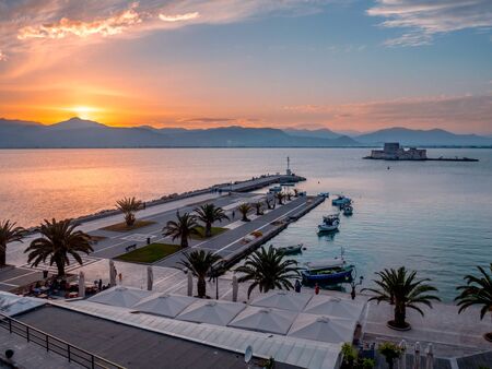 A panoramic view of the old harbour of Nafplio with the historical water castle of Bourtzi in the middle in sunset