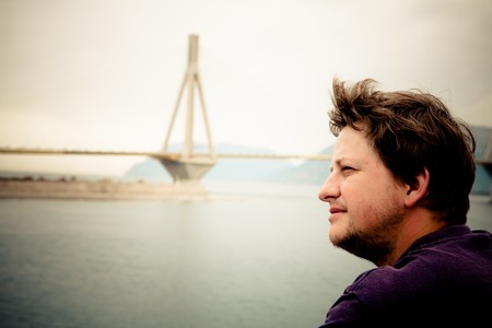 Portrait of a young man admiring the Rio Bridge in Greece.