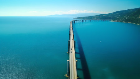 the Rion-Antirion Bridge in Greece, stretching across deep blue waters with stunning mountains in the background. A clear sky and bright light emphasize its modern, elegant design.