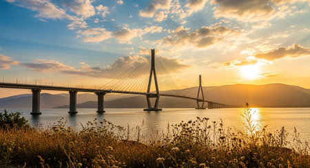 A beautiful scenic view of the rio antirio bridge in greece during sunset with mountains, water, and a golden sky. Perfect travel photography.