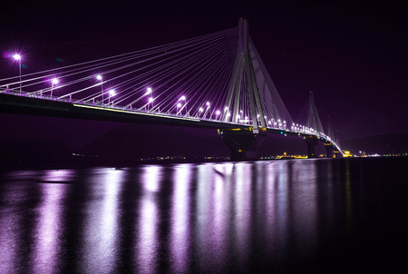 Modern Bridge at the night time with lights. Rion-Antirion Bridge, Greece, Europe. The Rion-Antirion Bridge in Greece one of the world's longest multi-span cable-stayed bridges and the longest of the fully suspended type brige