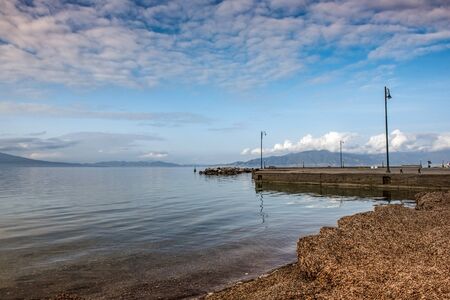 Cityscape of the Patras town in Greece with Corinth Gulf and Rio-Antirrio Bridge in the background with clouds in the sky