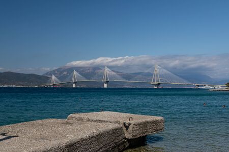 View of suspension bridge Rio-Antirio in Greece. Bridge crossing Corinth Gulf strait, Peloponnese, Greece