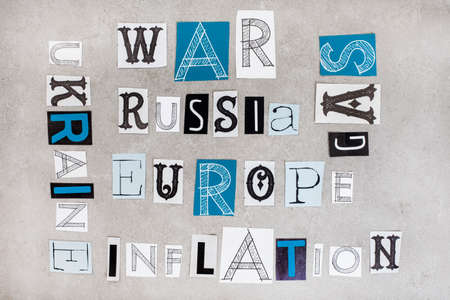 Russia, Ukraine and war, social issues surrounding it in magazine clippings on grey