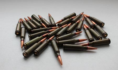 Closeup View Of live ammunition capsules for assault rifle laid out in rows on white background