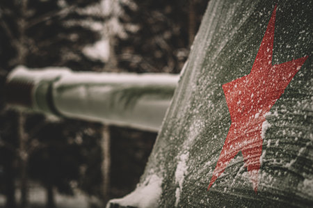 A red star in the frost on the tanks armor. Selective focus.